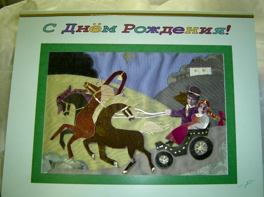 Коллаж из засушенных листьев и цветов с вмонтированными миниатюрными фотографиями Николая Баскова и его жены Светланы в русских костюмах в экипаже с тройкой лошадей.
